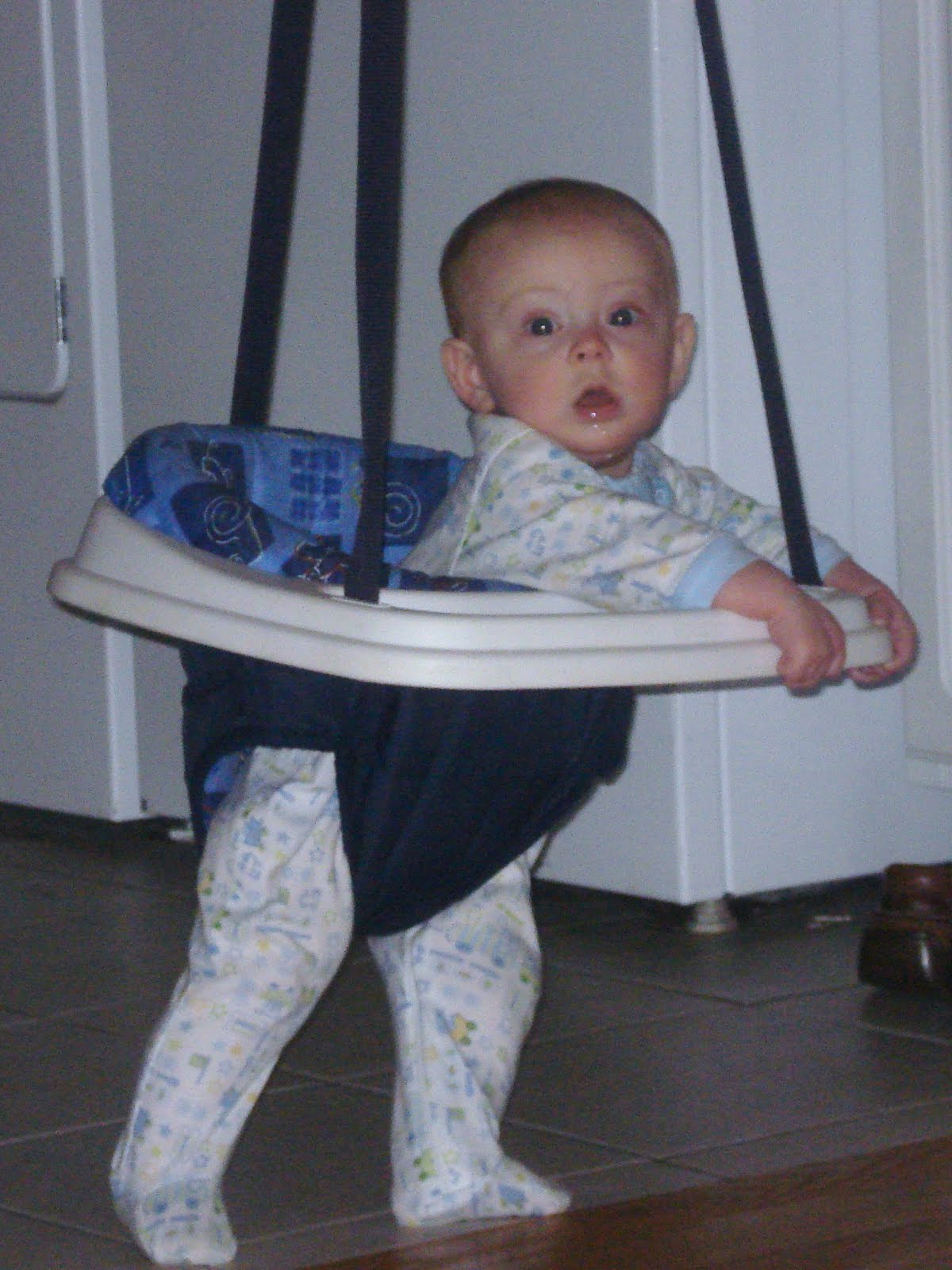 Sixty seconds after he first laid eyes on this jumper, Mac was a-bouncin' away. He might be afraid of where his parents go when he can't see them (outer space? Siberia? somewhere warm from which they'll never return?), but he's no scaredy-cat when it comes to trying new things.